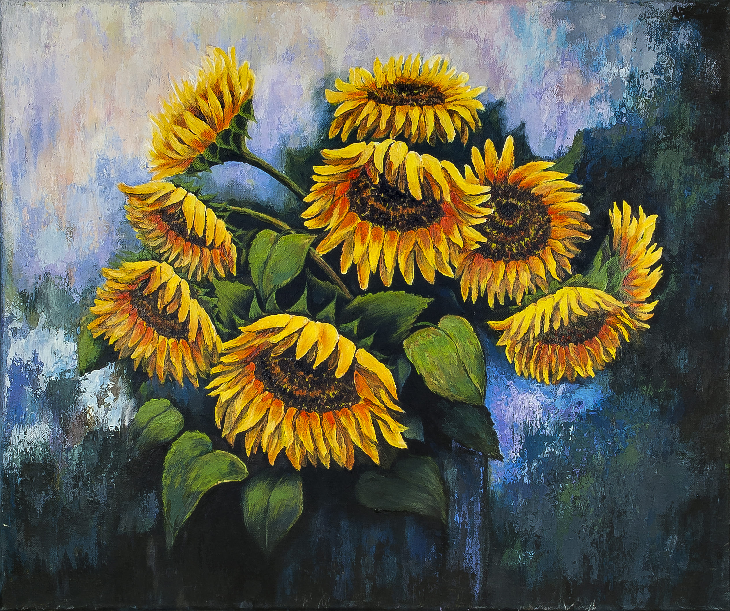 La técnica de espátula ha creado texturas ricas que juegan con el contraste entre luz y sombra, añadiendo profundidad a la obra. Los girasoles, vibrantes y cálidos, parecen capturar y reflejar la luz, invitando a la contemplación y elevando el espíritu. La espátula aporta una calidad táctil, con texturas que animan las sombras y magnifican el brillo de cada flor.