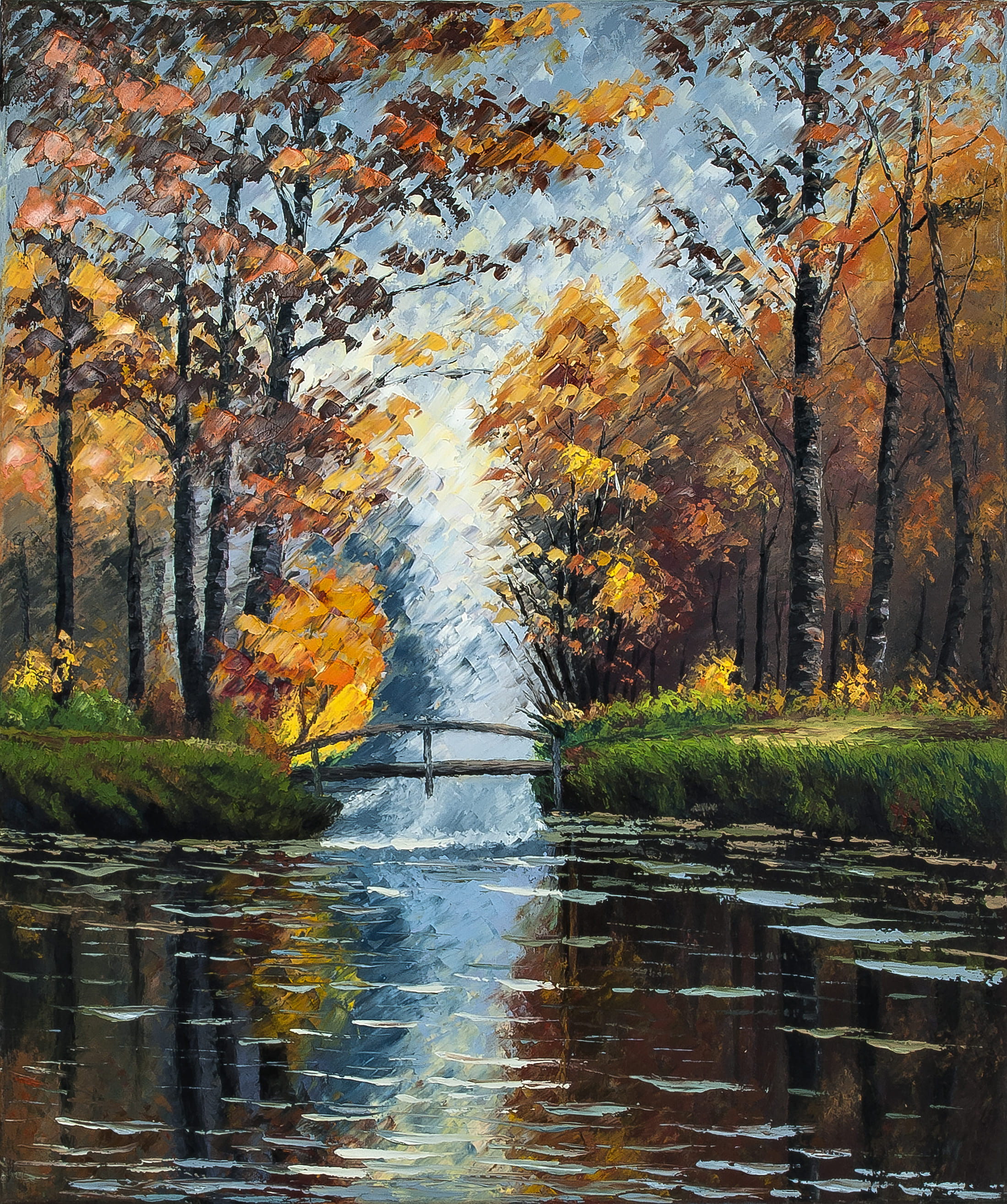 En primer plano, un observador silencioso se destaca, su presencia añade profundidad y perspectiva, invitando a los espectadores a cruzar el puente hacia un mundo de calidez y color. Los trazos texturizados de la espátula danzan sobre el lienzo, mezclando ocres, amarillos y naranjas en una sinfonía de colores cálidos que capturan la esencia del otoño. Esta obra invita a la contemplación y al descubrimiento, ofreciendo un refugio visual donde la naturaleza y la humanidad se encuentran en perfecta armonía.