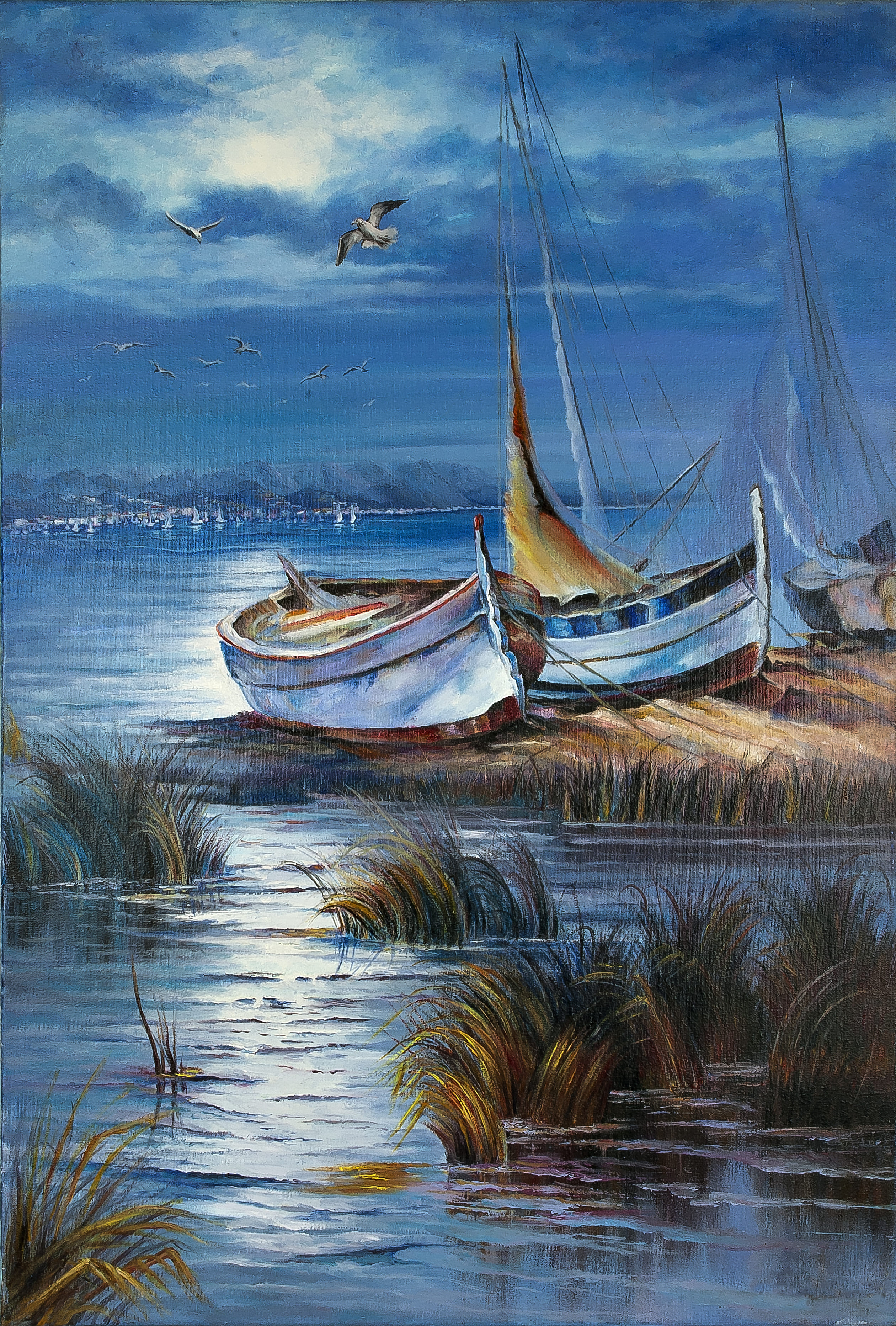 En el corazón del paisaje, las barcas son las protagonistas indiscutibles, ancladas en la calma, como guardianes silenciosos de la orilla. Su presencia es un testimonio de la vida que palpita en el umbral del día. Las gaviotas, en su danza aérea, parecen rendir homenaje a estas fieles compañeras del mar. Las hierbas, como lances de verdor, enmarcan la escena, señalando hacia las embarcaciones en reposo. El sol, aún tímido, se asoma entre las nubes, bañando a las barcas con un resplandor plateado que promete aventuras en el horizonte.