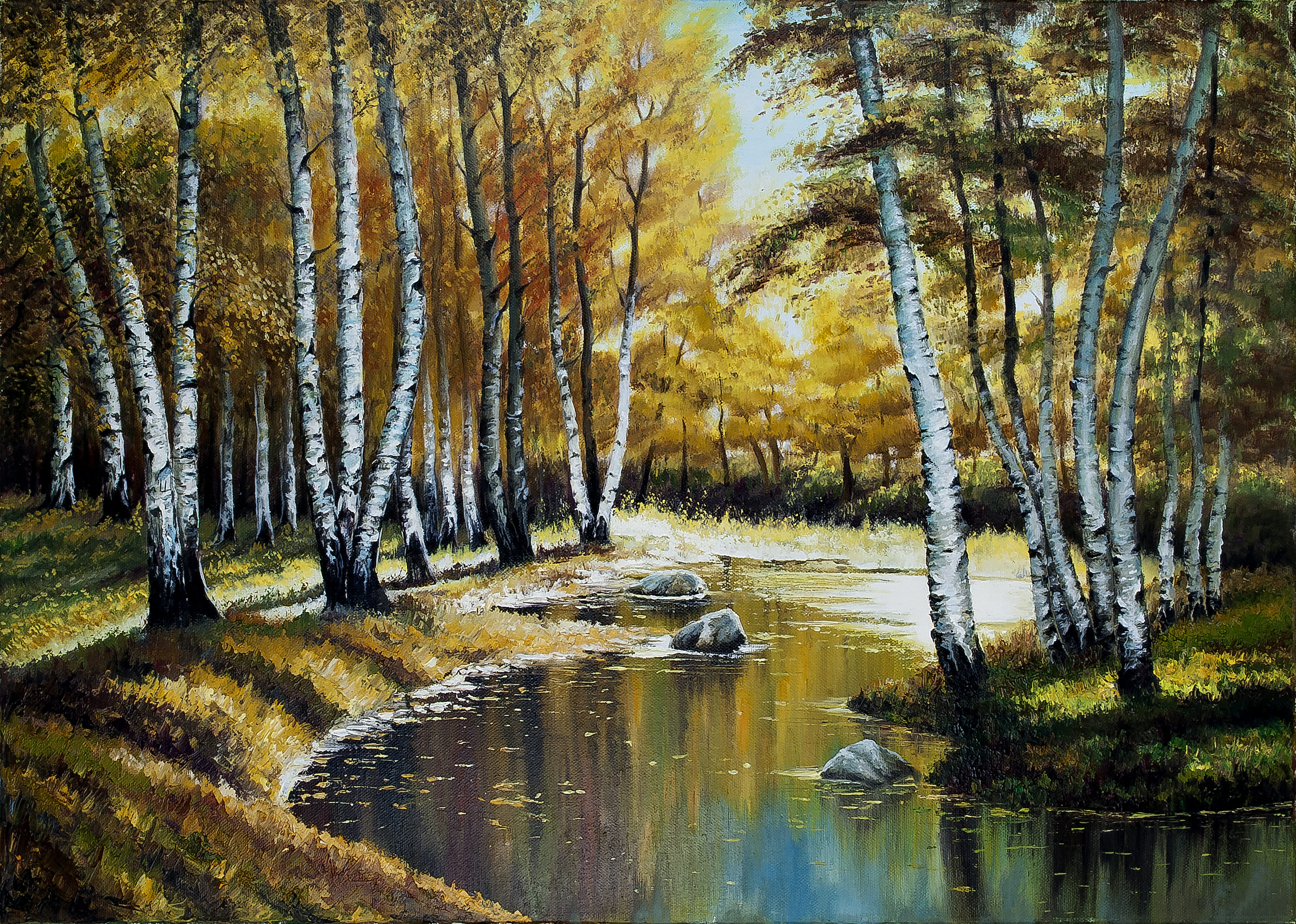 “Ecos de Otoño” retrata un tranquilo bosque de abedules, cuyas hojas doradas se reflejan en un arroyo sereno.