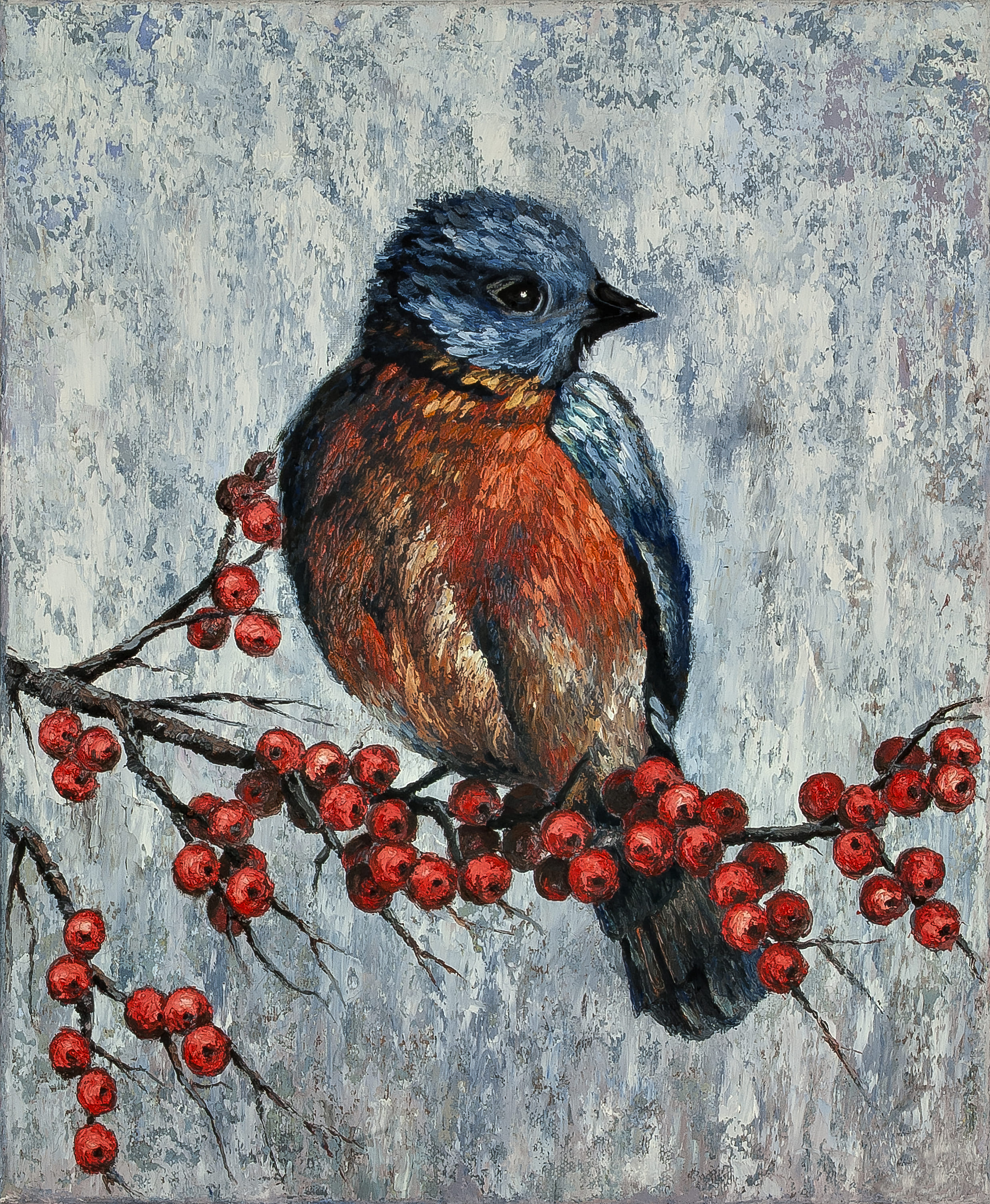 La obra destila la esencia del invierno, resaltando un sialia sobre su lienzo tranquilo y profundo.
