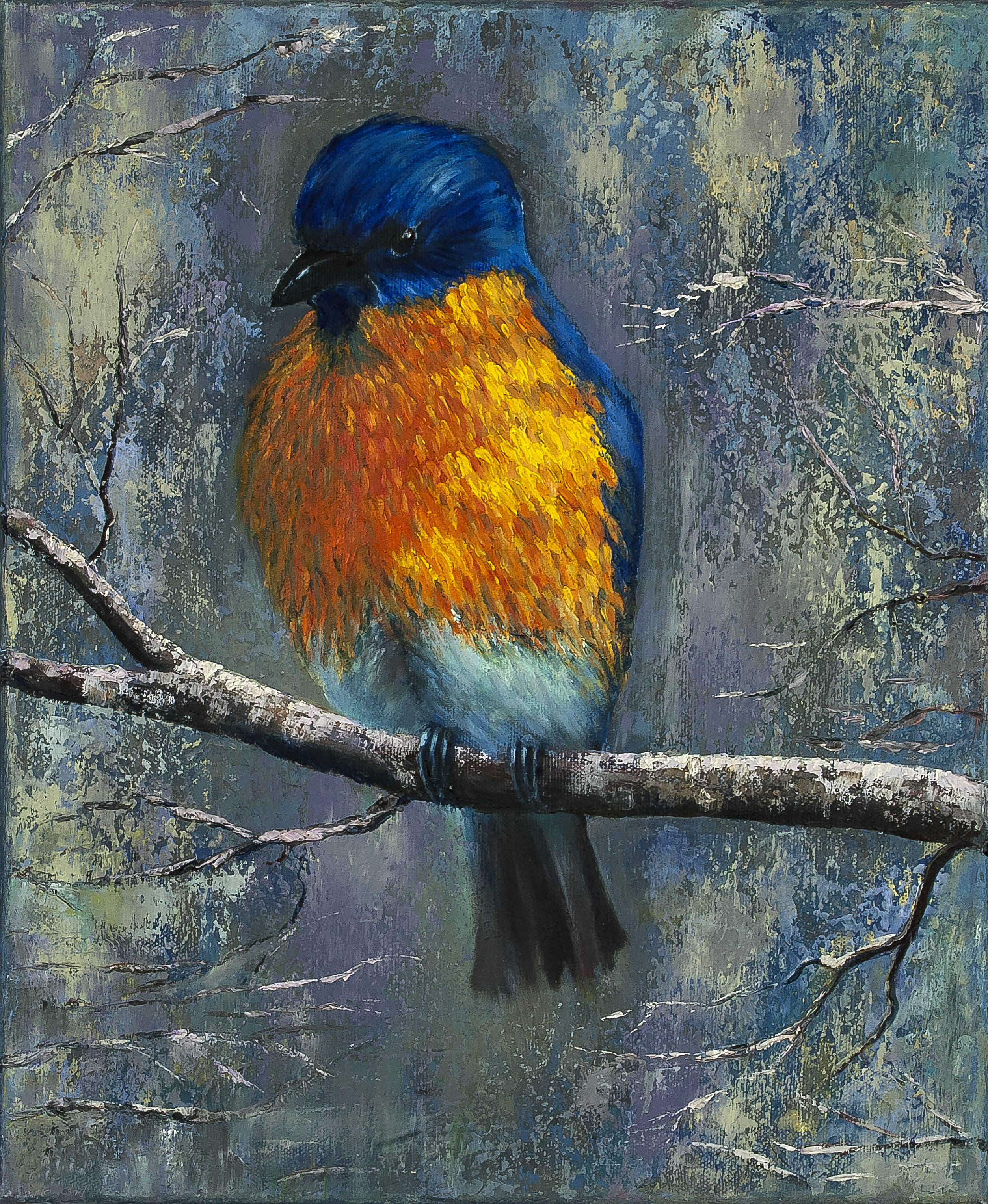 La obra destila la esencia del invierno, resaltando un sialia sobre su lienzo tranquilo y profundo.