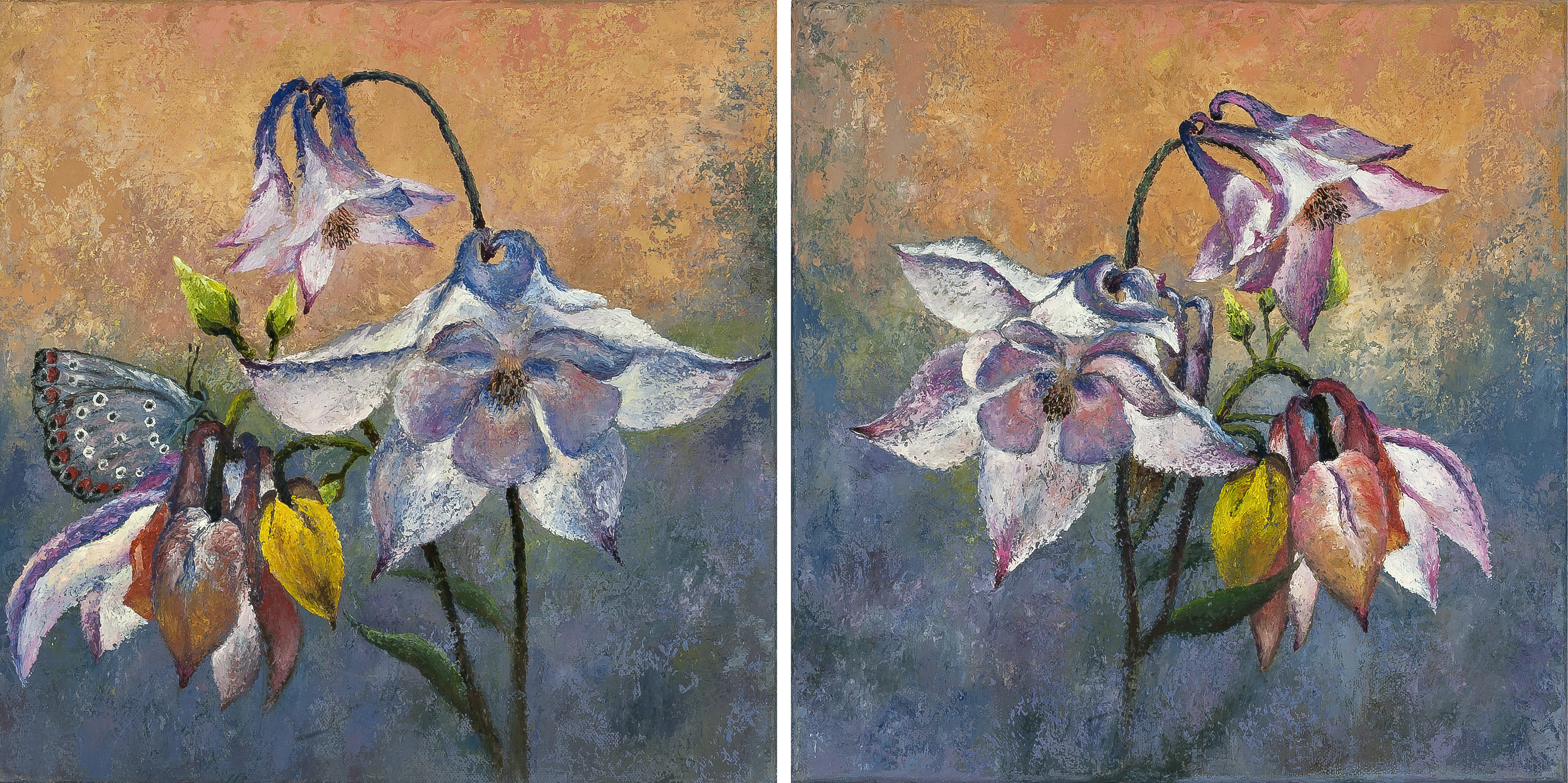 Estos dos cuadros, ejecutados con la paleta de óleos, presentan una hermosa escena primaveral con flores en un campo. La mariposa agrega un toque de vida y movimiento. La forma de las flores, la inclinación de la planta y los vivos colores convierten a esta pintura en una delicada obra de arte para decorar espacios elegantes y modernos.