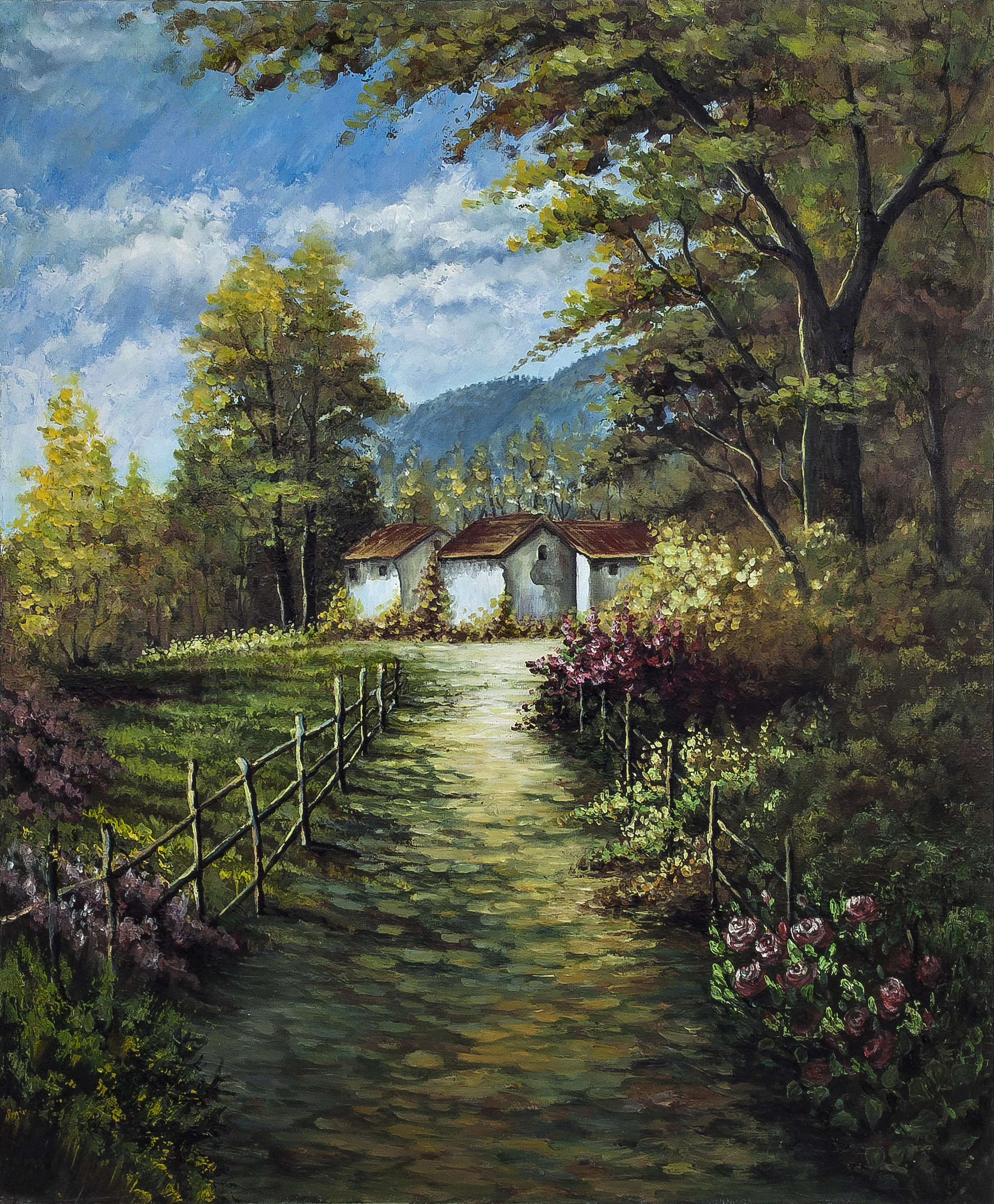 En el corazón del lienzo, la escena cobra vida con casas de blanca pureza y techos de tono terracota, enclavadas entre árboles robustos. Aquí, las pinceladas son definidas, resaltando la arquitectura campestre y la vegetación exuberante que anuncia el cambio de estaciones. El primer plano es una exhibición de color y textura, donde un camino serpenteante nos guía hacia el interior de la composición.